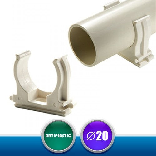 Clips fissatubo per il fissaggio a muro di tubi rigidi per scarico condensa con diametro 20 mm.