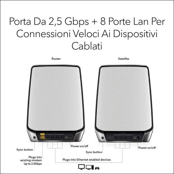 INFORMAZIONI: WIFI VELOCE Il WiFi più veloce di sempre. Tutte le tue attività online, a velocità eccezionali. I sistemi WiFi 6 tri-band consentono di aumentare la velocità Internet su tutti i dispositivi in uso. Con velocità wireless totali fino a 6 Gbps, puoi sfruttare i vantaggi di una connettività WiFi ultra veloce per Smart TV, smartphone e console di gioco. WiFi eccellente Velocità Internet sorprendenti e una copertura omogenea per ogni dispositivo, in ogni stanza della casa. Ultra veloce. Sempre. Grazie al backhaul WiFi 6, gli streaming video 4K o 8K UHD sono senza ritardi o buffering. A portata di mano Oltre a poter mettere in pausa il WiFi, potrai visualizzare tutti i dispositivi connessi alla rete, configurare il router ed eseguire molto altro con l'app Orbi. Copertura e capacità Più capacità di connessione. Maggiore copertura. Il sistema Orbi WiFi 6 dispone di una capacità di connessione 4 volte superiore ed è in grado di gestire 12 flussi contemporaneamente. Anche con più di 100 dispositivi connessi alla rete, vivrai un'esperienza WiFi fluida e senza interruzioni, in qualsiasi punto della casa.