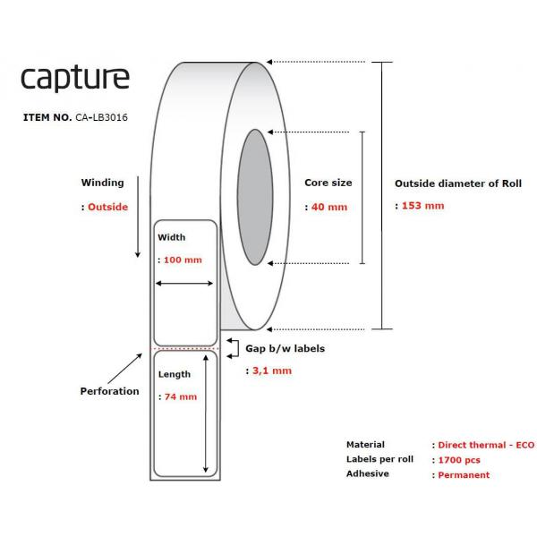 Capture CA-LB3016 etichetta per stampante Bianco (Label 100x74, Core 40, - Diameter 153 mm. Thermal - print. Uncoated. Permanent. 1700 labels per roll. 8 rolls per box.)