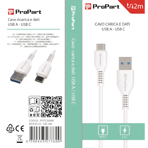 ProPart Cavo Carica e Dati Tipo-C 2.4 A. Lunghezza 2 metri Bianco