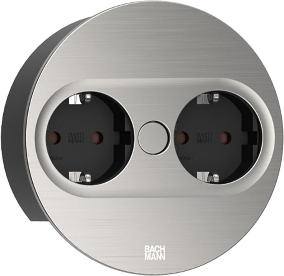 Bachmann TWIST 2 Metallische Abdeckscheibe rund, Edelstahl-Optik, 2xSchutzkontaktsteckdosen schwarz mit erhöhtem Berührungsschutz, Zuleitung 2,0m H05VV-F3G1,5mm² schwarz mit Aderendhülsen und beigelegtem Schutzkontakt-Montagestecker, verpackt im Karton. (946.000)